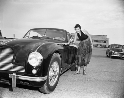 The Eagle Mountain National Guard Base car race is staged jointly by the Eagle Mountain National units and the Fort Worth-Dallas Sports Car Club, aims to provide funds for the guardsmen's recreation and athletic equipment needs. A wide and weird variety of vehicles answering to the general description of sports car at the race. Here, Mary Trippet looks over light aluminum-bodied Aston Martin. The Aston-Martin is noted for handling qualities gained from four-whell independent suspension, light tubular frame and stiamina of 2,500 c.c. engine. The race is slated forAugust 23.