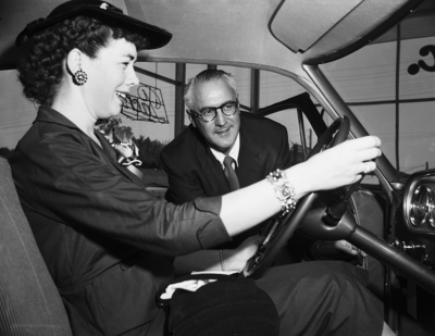 Mrs. Sammye W. Robbins of Weatherford sits for the first time in the new automobile she won Tuesday from Albert J. Meek included at Fort Worth. The Packard was presented by Paul D. Johnston, Southwestern zone manager, who looks on as she inspects her prize.