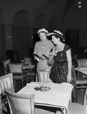 Photographed while previewing their assignments for the Woman's Club's first Fall style show luncheon are Mrs. Douglas Tomlinson, left, sitting chairman and Mrs. C. S. Bigham, chairman of decorations.