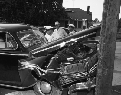Leonard Cathers, 3541 East Fairfax, turned into Gloco Service Station, 3812 East Belknap, Wednesday afternoon to get gas and hit a utility pole instead. He suffered a bloody nose. Accident Investigator H. W. King inspects Cathers' car.