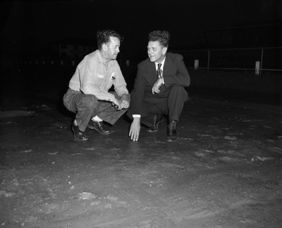 Bill Lind, right, an American Automobile Association official, kneels next to Babe Strap, left, as the two inspect the Arlington Downs track following weekend rain. Published in the morning edition, April 30, 1950.