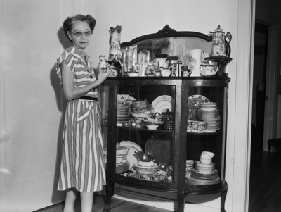 Mrs. Sullivan and heirloom China. Her home is a five-room house, full dining room, floor furnace with attached garage and a 195-foot deep lot. It is only 6 years old.