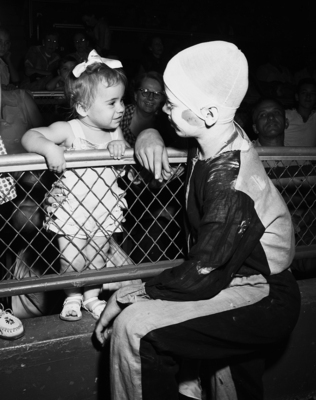 11-month-old Jamelyn Eldredge, daughter of Mr. and Mrs. J. E. Eldredge of 3404 Rufus, can't believe her eyes as she sees her first circus clown. The clown is Glenn Ray Walker, 12, of 1340 E. Davis.