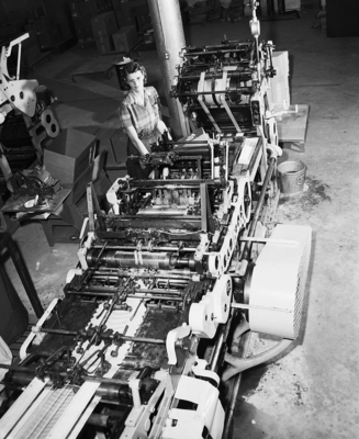 Mrs. Helen Forsythe of 4200 Joy Lee, operates one of the machines used by Tension Envelope Corporation of Texas, 5900 East Rosedale, to make envelopes. The corporation started production at its new factory, will be producing 700,000 envelopes a day. The company has employed nine Fort Worth residents since it started and will approximate 25 persons when full operation is reached.