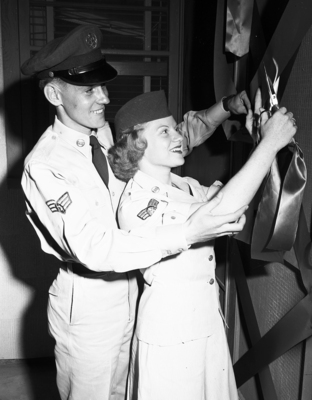 Cutting the ribbon Friday night to open the new service club at Carswell Air Force Base were Airman First Class Coleman Tally and Airman First Class Radonia N. Owens.