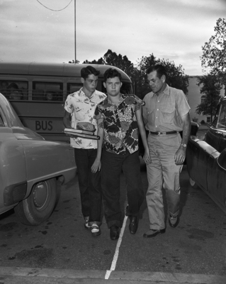 Pictured here in the center is Dick Haggard, 18, a former polio patient, being helped into Paschal High School by Lanham Atkinson, 17, and School Bus Driver James Molder.
