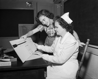 Peggy Daugherty, student at Mt. Carmel Academy, gets first hand instruction on reading a thermometer from Mrs. Gus Kuehn. A course in home nursing will be taught by Mrs. Kuehn at the Catholic school at 2006 N. Houston.
