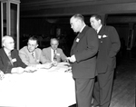 Checking in at the State Medical Association of Texas convention here, left to right, Doctors F. B. Malone of Lubbock, Troy Shafer of Harlingen, Joe V. Fleming of Engin, and standing, J. B. Copeland of San Antonio and G. W. Cleveland of Austin.