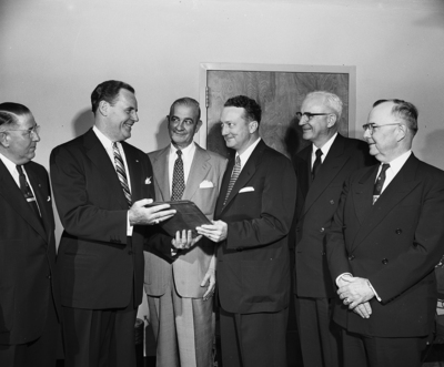 Plaudits came from many places for Howard G. Chilton, third from right, when Fort Worth, Dallas and other credit and retail merchants groups met at Amon Carter field. Left to right, Morris S. King, Harold Wallace, Lionel W. Bevan, Chilton, Charles T. Lux, and Wimberley Goodman. Chilton is manager of the Retail Merchants Association and manager of the Credit Bureau of Fort Worth. He is the new president of the Associated Credit Bureaus of America.