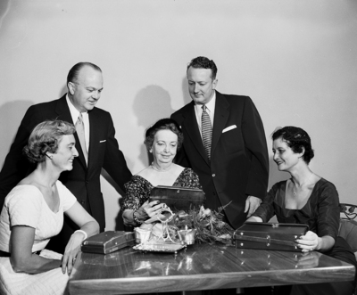 More honors came to the Chilton family when credit executives and retail merchants of Tarrant and Dallas Counties joined in a testimonial dinner at Amon Carter Field for Howard G. Chilton, standing right, new president of Associated Credit Bureaus of America. His brother, J. E. R. Chilton Jr. of Dallas, standing left, also served as ACBA president, as did their late father. Their mother, Mrs. J. E. R. Chilton Sr., center, admires plaque given Howard Chilton, manager of Greater Fort Worth Credit Bureau. Wives of the Chilton are seated beside them admiring other gifts.