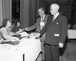 Registering at the Blackstone (lower photo) are Dr. Herbert Donnell, Waxahachie, left, and Dr. H. E. Griffin, Graham. Miss Mildred Whiteman, left, and Miss Tess Harris, of the association's Austin headquarters are handling registrations.
