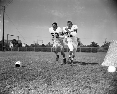 Ends Spud Wiley, left, and R. D. Ryno Jr. are a potential to see lots of service for North Side crucial game night with Arlington Heights. Number 53 and 12 are in this photo running with a hard intense facial expressions in their football uniforms and no helmets.