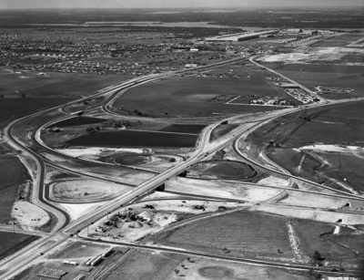 Complicated as it appears from the air, the maze of loops, turns, approach roads and grade separations shown here is relatively simple on the ground. It's the Highway 183 traffic circle at the intersection of the Convair superhighway.