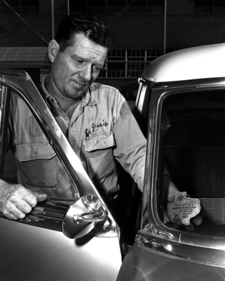 Jessie Brown, a motor company service department employee, was kept busy placing new inspection stickers, shaped like a map of Texas, on cars which passed inspection under Texas' new vehicle inspection law.
