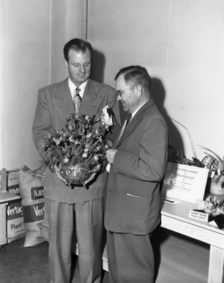 Conde Morris (left), president of the Fort Worth Men's Garden Club, stands next to J. T. Wheeler, general chairman, during the flower show held during the weekend. The two can be seen looking at a blue ribbon winning arrangement by Bkish Breland, that is being held by Morris. Published in the morning edition, May 1, 1950.