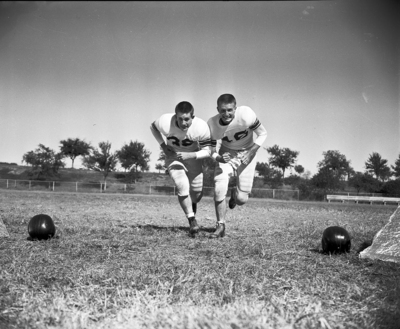 Arlington Heights has two fullbacks to throw at Paschal night. Left, Dick Thompson, who has been starting. Charles Pederson, who like Thompson is a senior, gives depth at the position. Teenage football players with jersey numbers 38 and 48 running through the field in their uniforms and pads.