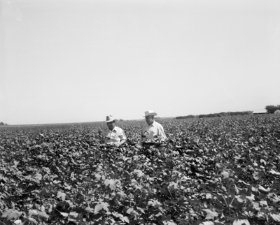 Hamilton, left, and Wendt stand in tall, irrigated cotton on the Hamilton farm in Wilbarger County.
