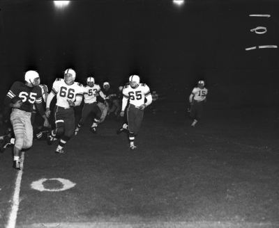 Tommy Winger (66) made the tackle on the Gainesville 38-yard line. On the right Jack Holt (65) of the Leopards. North Side pushed across two touchdowns and then coasted to a 20-7 victory over Gainesville at Farrington Field, September 17, in the initial games for both teams this season.