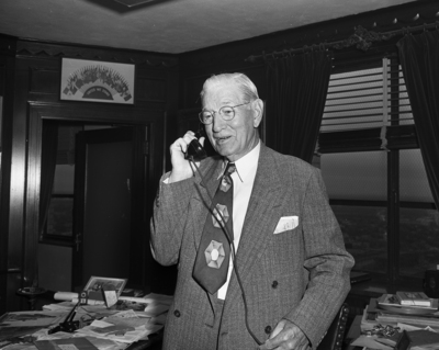 Image shows W. H. McFadden, an American Businessman from Virginia, standing in an office in front of a desk, holding a telephone to his ear. McFadden played an essential role in the opening up the oilfields of Oklahoma.