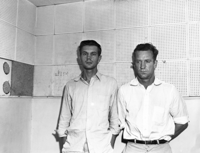 Charles Lee Jenkins, 22, left, a former Midland policeman, and Homer Richard Clinton, 36, were captured by an unarmed night watchman. The pair released a kidnap victim and tried several robberies and a burglary. The men were captured at 1:45 am Thursday as they were burglarizing a soft drink machine at Masonic Temple. The capture was the final failure in a long string of crimes the pair attempted. Published in the Fort Worth Star-Telegram September 18, 1953.