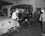 Russell Cornelison, a business man from Louisville Kentucky, is shown oiling up his 1901 Oldsmobile in preparation for continuing his trip to Los Angeles. The 50-year-old auto, Cornelison said, is weathering the trip better than its 50-year-old owner. Published in the morning edition, May 2, 1950.