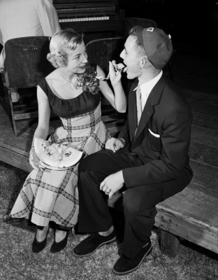 Pamela Britton, blonde star of the stage show "Guys and Dolls," feeds watermelon to her date, Texas Christian University Freshman James Swink, at a watermelon feast, on the college campus.