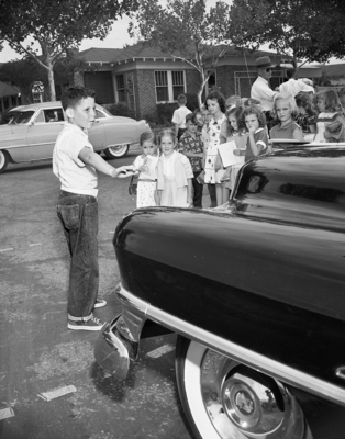 Patrolman Dick Greenman, 11, stops traffic so North Hi Mount School students can cross the street safely. Leading the way are Virginia Rogers, left, and Susan Behnke.