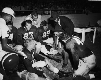 Strategy. Winning coach Abe Martin of TCU sketches a maneuver for end Johnny Crouch, left, and Ray McKown while assistant Walter Roach looks. Abe Martin makes his first competitive start as TCU head coach, sent the Frogs out against Kansas University in new battle formation - Split T - after years of staunch adherence to wingback-style attack. Frogs defeat the Jayhawks, 13-0 at Amon Carter Stadium before 26,000, the largest opening home crowd in the school's history.