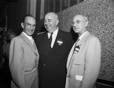 Old Soldiers - Arrivals for the 37th Roll Call of the First Officers Training Camp Association, including left to right, Roger Sanford, rancher from Cloete, Coahuila, Mexico; Ike Ashburn of Austin, publisher of Texas Parade, and Justice Meade Griffin of the State Supreme Court.