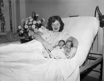 Tech. Sergeant T. T. Turner and his wife were proudly displaying their two sets of twins, trying to hide their surprise at having twin boys only 11 months after the birth of twin girls. Mrs. Turner, 24, at Harris Hospital, holds Donald, in the middle, and David, on the right. The Turners also have three other children, ranging up to 6 years old.
