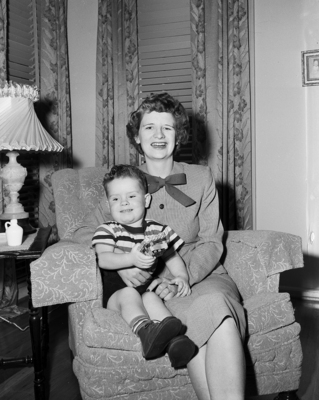 Mrs. Leonard R. McCarthy of Cupertino, California, sits with her son Joe. The photo was taken as the two visit Mrs. McCarthy's parents, Mr. and Mrs. J. F. Lilley, of 4333 Pershing. Published in the evening edition, May 2, 1950.