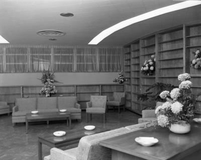 The library in the Fort Worth Academy of Medicine will feature race and classical medical books and current medical periodicals. The furniture is upholstered in tweedy green and brown material.