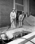 Image shows Air hammer operator Rex Rains and county maintenance man Odell Averett inspecting progress at the end of the first day's work on repairs to Tarrant County Courthouse. The repairs focused on the time-damaged concrete flooring at the top of the Main Street entrance to the courthouse. Published in the evening edition, May 2, 1950.