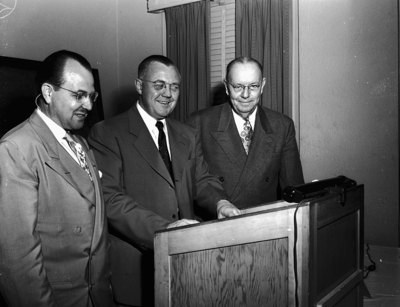 At the Texas Air-Medics Association are State Health Officer George W. Cox of Austin, shown at right. With him are Dr. L. P. Walter of Austin, secretary of the Conference of City and County Health Officers, and Dr. Ernest L. Stebbins, center, dean of Johns Hopkins University's public health school at Baltimore.