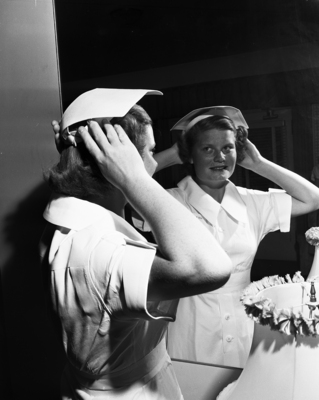 Deciding which hat to wear will be no problem for Winifred Carter, 18, student nurse from Hawaii. Winifred got her fist chance to try on a uniform at TCU Harris College of Nursing.