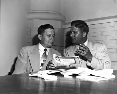 Fort Worth Life insurance men became U. S. Treasury Department "Minute Men" to encourage expansion for payroll deductions for defense bonds. Among them were Tom James, left, and Bob Eakin.