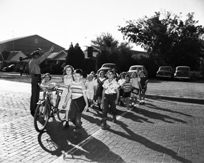 Motorcycle Patrolman H. H. Pricer raised the protective arm of law over Arlington Heights Elementary School pupils as they crossed Camp Bowie Blvd. at the El Campo intersection. City Council ordered patrolmen at the Camp Bowie-El Campo and Neville-Byers intersections after a delegation of mothers and fathers demanded immediate traffic protecting for their children at the street crossings.