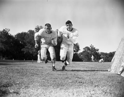 Garfield Spradley, left and Bill Courtney will be Paschal's halfbacks against Woodrow Wilson at Farrington Field. The Wildcats are unbeaten in three games this season. They are running on the field.