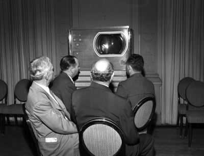 These Texas doctors, part of the approximately 1,000 who saw a demonstration of surgery on color television, watch one of the 11 TV receivers set up in the Crystal Ballroom of Hotel Texas as Dr. R. R. White of Temple removes a section of cancerous colon of a Fort Worth man at St. Joseph's Hospital.
