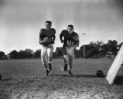 Ronnie Tackett, left. and I. B. Childs. for Poly touchdown blows. Both shown running with footballs.