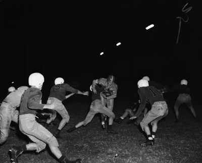 Laneri's Velton Evans plunges for Micks first touchdown against Burleson, in 33-0 victory at Handley Field. All players trying to catch a football.