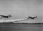 Three F-84 "Thunder jets" roared from the runway at Barksdale Field, Shreveport, fully loaded with Jato assist for added power in the first take-off ever attempted by this type of long-range fighter craft under a full load. The planes are from the 8th Air Force's 27th Fighter Wing based at Bergstrom Field. Published in the morning edition, May 3, 1950.