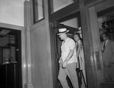 City Councilman T. L. Carleton, charged with arson in connection with the Bender Hotel fire, is shown here, left, as he entered the district attorney's office. With him are County Detectives Dusty Rhodes, center, and Bill Shelton.