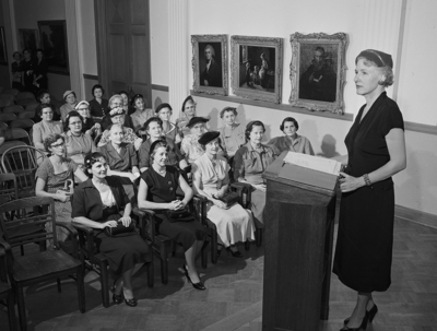 Mrs. Leo R. Kent addressing group of ladies.