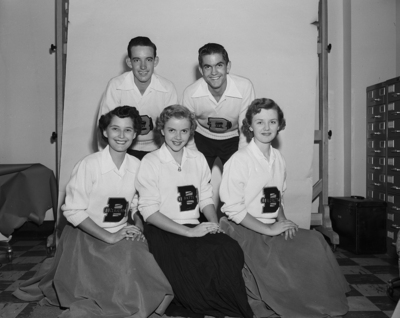 Students of Birdville High School's cheering section will be directed at football and basketball games by six leaders. Left to right, front row, are Claudine Etheridge; Patti Daniel, Loretta Lambert, Kenneth Reitmeier. The sixth leader, Robert Sparks, is not permitted.