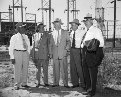Participants in the dedication of Lake Stamford and the open house at the West Texas Utility Company's new plant on the reservoir's shore were, left to right, W. L. Cooper, president of the Stamford Chamber of Commerce; Edwin Vennard of Chicago, president of the Middle West Service Company and the program's principal speaker; Prince Campbell of Abilene, president of West Texas Utility; Simon W. Freese of Fort Worth, consulting engineer on the project, and E. E. Farrow of Dallas, contractor who laid the water line from Stamford to the lake.