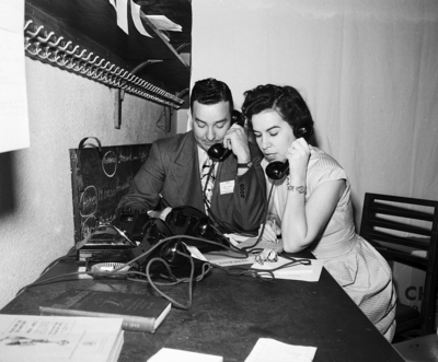 Two harried message center workers at the State Medical Association meeting are Raymond C. Hollabaugh of Fort Worth and Miss Ruth Trahan of Austin.
