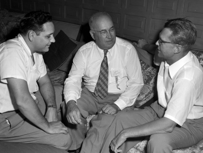 Left to right: D. R. Wall Junior, Dallas, crude oil purchasing and sales department, Magnolia Petroleum Company; L. S. Omohundro, Sherman, president, Merchants & Planters National Bank, and Fred H. Moore, Dallas, assistant to J. L. Latimer, Magnolia president.