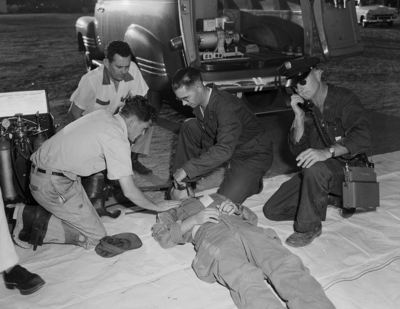 A mock casualty in Arlington's Operation Dry Run, Herman J. Matzke, 19, Arlington State College student from Galveston, receives simulated respirator treatment from volunteer members of Arlington's fire department. Left to right are Johnnie Klapper, Fire Department Chaplain M. P. Bishop, G. C. Pierce Junior and Theo Huffman Junior.