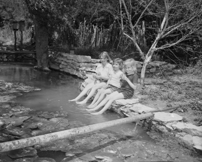 Here, left to right, are Suzanne, Penny, and Nancy Adams, daughters of Mr. and Mrs. Wayland Adams of 2322 South Adams, Dallas, as they cooled their feet in a branch fed by an artesian well while visiting their grandparents Mr. and Mrs. E. T. Adams, at Glen Rose. A son, Wayland Jr., was present but not pictured.